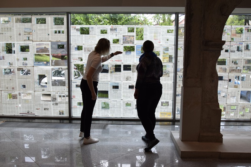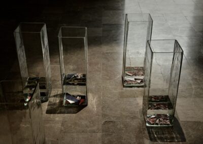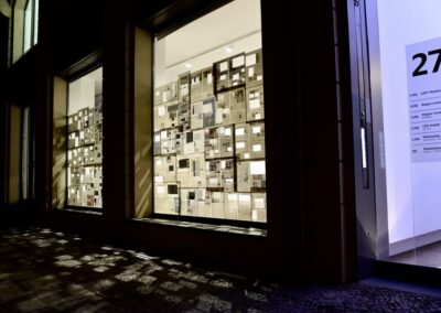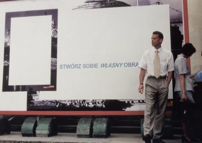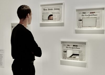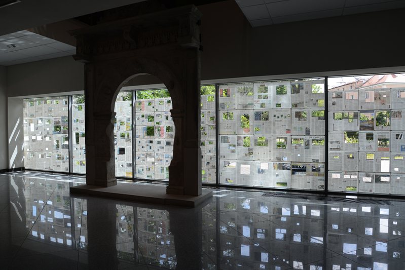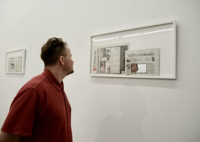 Wykorzystując nowoczesną przeszkloną fasadę budynku muzeum, przekształciłem ją w medium obrazów, znaczeń i kontekstów. Ona działa jednocześnie jako ekran i filtr: zdjęcia prasowe zostają z gazet wycięte, pozostawiając puste prostokątne otwory, przez które – w zależności od pory dnia i kąta padania światła – odbiorca widzi albo wnętrze muzeum, albo uliczne życie. Te „brakujące obrazy” tworzą wizualną lukę, która prowokuje do refleksji nad tym, czego w medialnych narracjach nie widać – nad tym, co pominięte, zredukowane lub ideologicznie sformatowane. W rezultacie moje najnowsze instalacje są nie tylko interwencją w przestrzeń publiczną, lecz także propozycją nowej formy uczestnictwa w kulturze wizualnej – takiej, która domaga się od odbiorcy czegoś więcej niż biernego spojrzenia. Widz, który świadomie patrzy, zyskuje moc – nie jest już bezbronnym odbiorcą, ale uczestnikiem procesu. On sam może decydować, jaką funkcję pełnią w jego życiu obrazy.