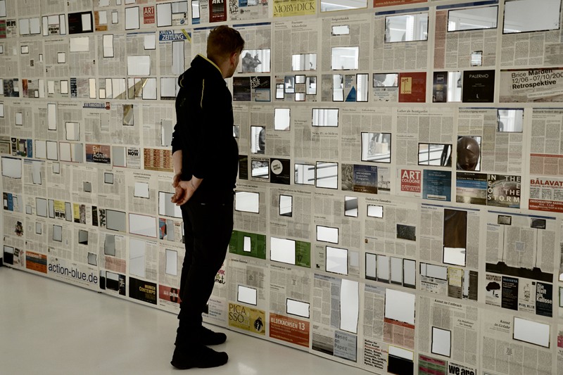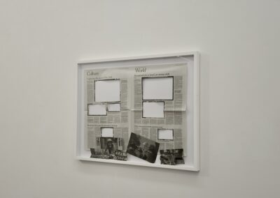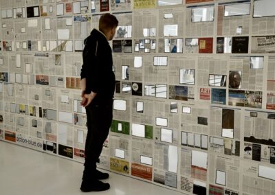 W swojej pracy nie ograniczam się więc do tylko jednej strategii czy jednego języka. Dużo zmieniło się, kiedy w cyklu Behind Images (2013) zamiast pojedynczych stron zacząłem używać kilku stron gazet, a nawet ich całych egzemplarzy. Wycinanie zdjęć spowodowało ujawnienie w miejscu pustki obrazów ukrytych na dalszych stronach. W pracach z zapoczątkowanego w 2020 roku cyklu NieUwidocznienie pustka po wyciętych gazetowych zdjęciach została wypełniona lustrami, nadając tym pracom charakter interaktywny.