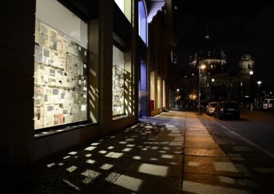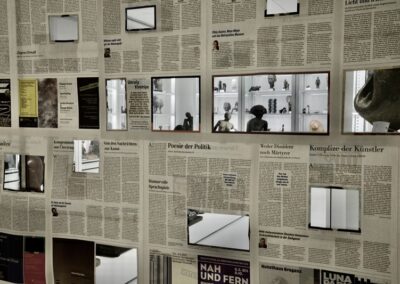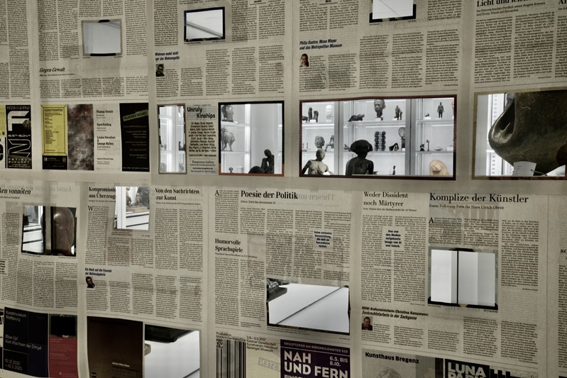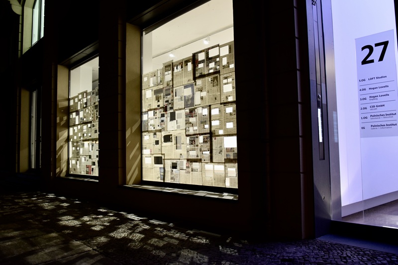 W 2023 roku w Kunsthalle Rostock instalację Skulpturen-Bilder poszerzyłem o element przestrzeni. Po raz pierwszy gazety z wyciętymi zdjęciami przymocowałem na szklanej ścianie oddzielającej pomieszczenia wystawowe od ulokowanej we wnętrzu Kunsthalle stałej wystawy kolekcji rzeźb. Takie otwarcie się na przestrzeń doszło dobitniej do głosu w instalacji Ad Interim (2023) pokazanej na fasadzie Instytutu Polskiego w Berlinie na przełomie 2023 i 2024 roku. Umożliwiło ono jej oglądanie zarówno publiczności odwiedzającej wystawy we wnętrzu instytutu, jak i przechodniom na ulicy.