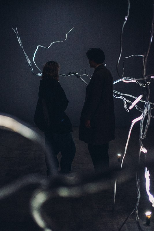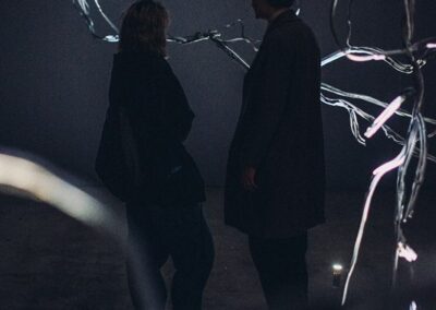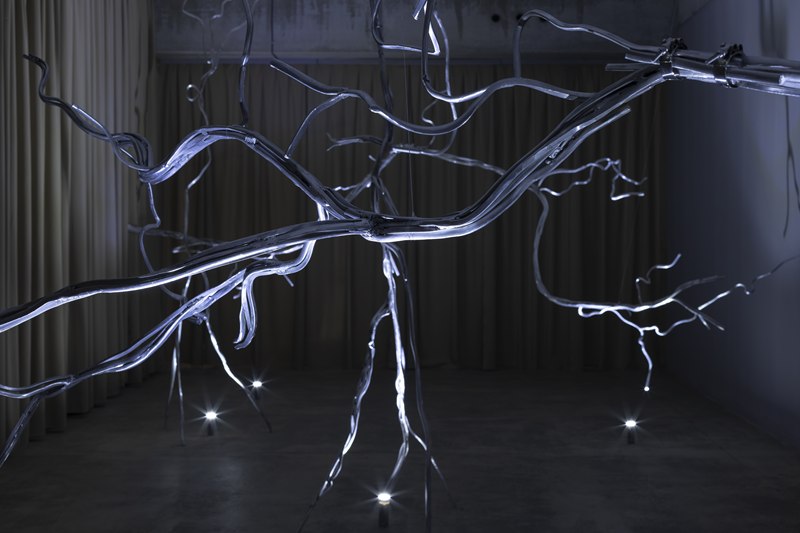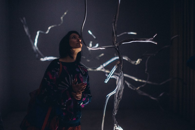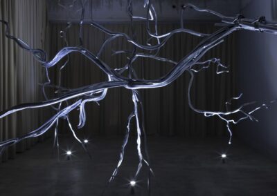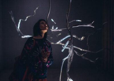 Jednym z najbardziej spektakularnych obiektów artystki okazała się realizacja przygotowana na wystawę Hiperobiekty w Studio BWA Wrocław wiosną 2025 roku. Anna Bujak stworzyła imponujący Pokój piorunów (2025), miejsce, w którym aluminiowe żyły pozyskane wtórnie z kabli wysokiego napięcia otrzymały drugie życie – stały się w procesie twórczym instalacją, łudząco przypominającą zatrzymany w czasie rozbłysk elektryczny. Po aluminium w czystej niemal postaci wspaniale ślizgało się światło. Pokój pogrążony w mroku, z kilkoma punktami świetlnymi i zjawiskowymi, srebrzącymi się kształtami, pełen Lynchowskich kotar, wydawał się tajemniczy i wizualnie zachwycający, szybko stał się także popularnym motywem w relacjach pojawiających się w mediach społecznościowych. Jego negatywem było Widmo (2025) – niewielka czarna przestrzeń, w której jawił się kształt pioruna: obiekt pomalowany światłoczułą farbą, majaczący w zupełnej ciemności niczym powidok, jaki widzimy pod powiekami moment po zobaczeniu pioruna. Czerpiąc z filozofii Timothy’ego Mortona i ontologii zorientowanej na przedmiot (object oriented onthology), artystka stworzyła niezwykle ciekawą wystawę pełną odniesień do niewidzialnych sił i oddziaływań, które Timothy Morton nazywa hiperobiektami – elektryczności, magnetyzmu, promieniowania radioaktywnego czy chemii obecnej między dwojgiem ludzi dzielących razem życie. Temat okazał się nośny – na spotkanie w Studio BWA Wrocław, na które przyjęli zaproszenie poznański filozof i autor wstępu do Mrocznej ekologii Timothy’ego Mortona, Andrzej Marzec, oraz tłumaczka tej książki na język polski i znawczyni amerykańskiego filozofa, Joanna Barcz, licznie przybyła publiczność i wywiązała się ciekawa dyskusja, przebiegająca w atmosferze pewnego intelektualnego fermentu. Za tę wystawę i wszystko, co się wokół niej wydarzyło, Anna Bujak zupełnie zasłużenie otrzymała nagrodę Emocje Radia Wrocław w kategorii sztuk wizualnych i tym samym dołączyła do grona jej świetnych dotychczasowych laureatów – przypomnijmy, że zwycięzcą zeszłorocznej edycji konkursu był Yuriy Biley z Open Group.