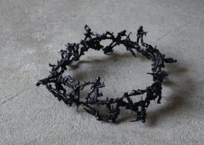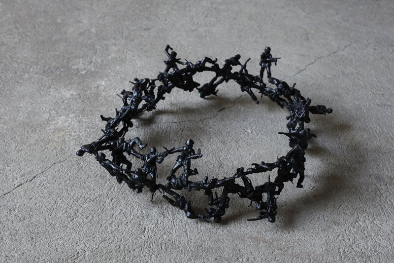 Temat obecnego zagrożenia wojną i eskalacji zbrojnej rosyjskiej inwazji, która zaskoczyła i zmroziła Europę po raz pierwszy na tak dużą skalę od ostatniej wojny światowej, oraz jednoczesnego kryzysu humanitarnego na granicy polsko-białoruskiej Anna Bujak zawarła w pracy Border-line (2021) – koronie cierniowej wykonanej z plastikowych żołnierzyków. Zabawkowe figurki to chętnie wykorzystywane przez artystkę przedmioty gotowe, dzięki którym modus gry i zabawy, odtwarzania rzeczywistości dorosłych przez dzieci, przeplata się z chrześcijańską koncepcją winy, grzechu i odkupienia przez cierpienie. Wymowa pracy, jak sugeruje sam tytuł, dotyczy podwójnych standardów, pewnego rozdwojenia jaźni narodu szczycącego się kultywowaniem chrześcijańskich wartości, w tym miłości bliźniego –zjawiska bezwzględnych push-backów imigrantów z terenów Afryki, Azji czy Bliskiego Wschodu, prowadzących do ich uwięzienia w przygranicznym pasie, w tym kobiet i małych dzieci umierających z głodu i wyziębienia w lasach, i karania wolontariuszy niosących im pomoc, przy jednoczesnym masowym przyjmowaniu imigrantów z terytorium Ukrainy przy innej naszej granicy i nagradzaniu bohaterskich wolontariuszy niosących im pomoc. Na poziomie czysto humanistycznym, odartym z doraźnych międzynarodowych polityk, Autorka zadaje podstawowe pytanie o to, które życia są ważniejsze.