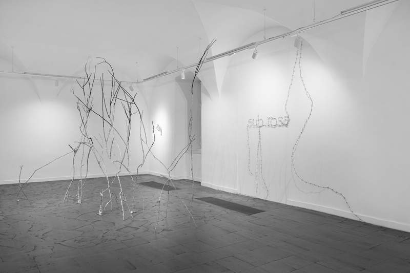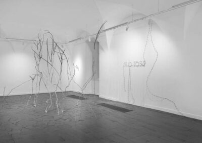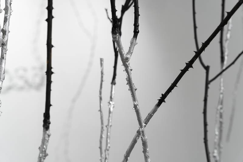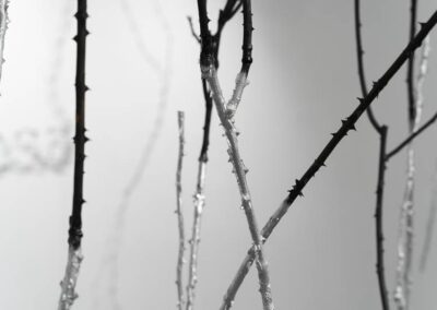 O kobiecej naturze – jej atrakcyjności i drapieżności – opowiadają jeszcze dwie inne prace, o których chciałabym wspomnieć. Fetysz (2021) to skórzane damskie buty z rzędem akrylowych zębów, do złudzenia przypominających prawdziwe w miejscu suwaka. To jednocześnie seksowny przedmiot pożądania, symbolizujący pragnienia, ale i – dzięki skojarzeniom z vagina dentata – źródło męskiego lęku przed kobiecą siłą i mocą sprawczą. Drugą pracą jest Rosarium (2025) – sporych rozmiarów instalacja z fragmentów różanych gałęzi odlanych częściowo z aluminium, a częściowo skonstruowana z fragmentów rzeczywistych gałązek. Praca miała premierę na wystawie Chcę tylko róż w galerii Jana Tarasina w Kaliszu latem 2025 roku jako część zwycięskiego projektu w ogólnopolskim konkursie na projekt kuratorski, który wspólnie z Anną Bujak wygrałyśmy. W pracy tej pobrzmiewa pewna ambiwalencja: z jednej strony jest to czytelny symbol kruchości i delikatności utożsamianej z kobiecą naturą, która także, przy braku zachowania ostrożności może boleśnie zranić, z drugiej zaś – czysta, zobrazowana w przestrzeni galerii wola konstruowania, ciągły imperatyw tworzenia, który można porównać z wysiłkiem ogrodniczki, uprawiającej skrawek ziemi zabrany naturze w dzierżawę. Instalacja bezpośrednio z Kalisza trafiła wprost do Wrocławia na wystawę The Beauty and the Beast w galerii Neon ASP Wrocław, na której prace Anny Bujak zaistniały w dialogu z malarstwem jej męża, Huberta Bujaka, otwierając tym samym kolejny sezon wystawienniczy w galerii. Ten niezwykle ciekawy dialog artystyczny, traktujący o sile miłości i procesie twórczym, można oglądać w galerii Neon ASP do 22 listopada 2025 roku, do czego gorąco zachęcam.
