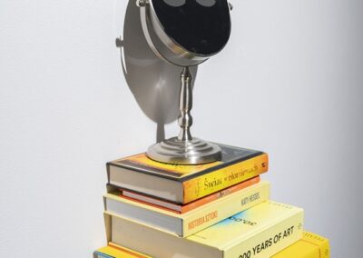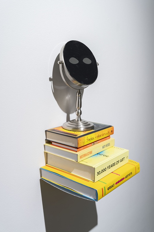 Istotnym rysem twórczości Anny Bujak są rozważania na temat feminizmu, bycia artystką i pisania herstorii. Jedną z moich ulubionych prac dotykających tej problematyki są Oczy czarnego lustra (2021) – na stosie książek, mówiących o lukach w tworzeniu dyskursu i kanonów historii sztuki, jak 30,000 Years of Art, Historia sztuki Katy Hessel, Świat w płomieniach Siri Hustvedt czy eseju Lindy Nochlin Dlaczego nie było wielkich artystek?, stoi lusterko, przy jakim zwykle kobiety nakładają poranny makijaż. Jego tafla została zamalowana czarną pochłaniającą światło farbą black 2.0, pozostały tylko dwa niewielkie niezamalowane pola – miejsca na oczy. I to właśnie spojrzenie staje się tu głównym bohaterem pracy – para własnych oczu patrzy na widza, pozbawionego reszty twarzy, a zatem płci i kulturowej tożsamości. Pozostaje tylko istota człowieka – zwierciadło jego duszy, wyzwolone ze społecznych schematów i z narzuconych ról. Oto osoba artystyczna (ale także krytyk i odbiorca sztuki) przede wszystkim jest człowiekiem, a dopiero potem kobietą czy mężczyzną lub jeszcze kimś innym, kto sytuuje się gdzieś poza binarnym podziałem płciowych klasyfikacji. W sztuce powinna liczyć się dobra sztuka, bez względu na to, czy jest tworzona przez kobiety czy mężczyzn. Jest to jednak oczywiście utopijna wizja, niewiele mająca wspólnego z rzeczywistością, z utartymi i przyjętymi hierarchiami i kanonami, wypracowanymi w patriarchalnym świecie i spisanymi w opasłych tomach.