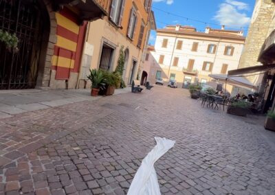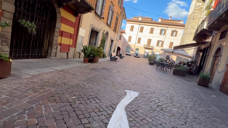 Stań tyłem do ołtarza, po lewej stronie odnajdziesz kolejną interwencję wideo. Rzutnik wyświetla poruszającą historię, w której tkanina staje się aktorem. Le Quattro Vie (Cztery Drogi) to opowieść o wędrówce. Zobaczysz szarfę materiału poruszaną wiatrem, która samotnie „podróżuje” po starożytnych uliczkach Breno, zbierając pył i pamięć miasta. Płótno, jak pielgrzym, w finałowej scenie podąża w stronę kościoła, wpływa po schodach do jego środka, wchodzi do sfery sacrum i w końcu składa się na marmurowych stopniach ołtarza.