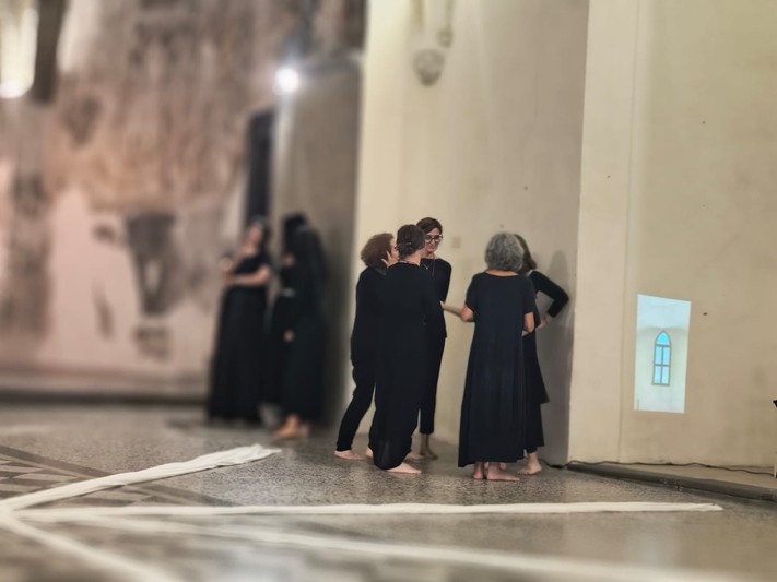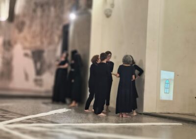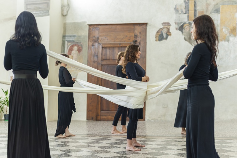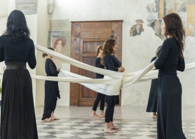 Przyklękamy, schylając się synchronicznie. Podnosimy końcówki tkaniny. Przyciskamy materiał oburącz jak skarb, napinając płótno delikatnie. Dzielą nas metry, lecz jesteśmy powiązane. Bose. Współzależne. Dostrojone. Kolejny wdech jest już wspólny. Wydech. Znak, że pora ruszyć. Krążymy powoli wokół centralnej postaci. Z każdym kolejnym krokiem tkanina owija się ciaśniej wokół jej ciała. Zbliżamy się do siebie, współodczuwając. Łączymy się w uścisku, aby za chwilę zmienić kierunek, który nas od siebie oddali. Patrzymy sobie w oczy. Wokół panuje cisza, a oddech wyznacza rytm naszych kroków. To one wiążą nas i rozwiązują. Ten skoordynowany ruch nie jest tańcem, to raczej rodzaj zbiorowego transu. Rytuał który splata i rozplata więzy. Czujemy chłód zmarzniętych stóp i ciepło rozpalonych twarzy. Oddychamy razem. Jesteśmy sobie bliskie. Wspólne są nasza ekscytacja i wzruszenie.