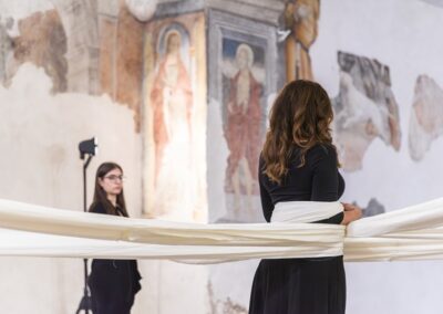 Jako kuratorzy i mediatorzy nieustannie zadajemy sobie pytanie o to, czym jest dzieło sztuki. Obiektem w galerii czy działaniem, które ma moc przemiany? Oddech i ciało. Bawełniana nić, wstążka, tkanina i płótno. W tej opowieści są materialnym łącznikiem między sztuką a ludźmi i ich historią. Maria Lai związała fizycznie i duchowo mieszkańców swojej wioski. Autorzy Respiro powtarzają ten gest. Przez subtelne interwencje transformują świątynię w „żywe ciało”, zapraszając społeczność do współuczestnictwa w tym procesie. Budują wspólnotę i nadają jej nowe znaczenia w historycznych odniesieniach. Legarsi alla montagna miało wartość etyczną, osiągając cel tam, „gdzie nie udało się religii i polityce”. Respiro aktualizuje ten paradygmat. Błękitna wstążka Marii Lai znajduje swoje odzwierciedlenie w bieli płótna podczas intymnego kobiecego rytuału. Ta sama nić przeszywa splot koronek instalacji Supplica i udaje się w samotną pielgrzymkę Le Quattro Vie.
