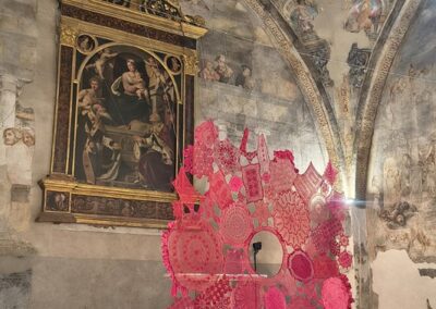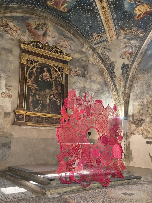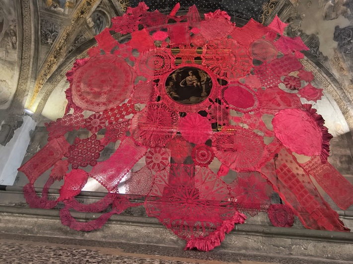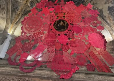 Twoje spojrzenie ucieka w stronę prezbiterium. Tam, gdzie dominują krzykliwe sceny męczeństwa i biblijnego patosu, rozpościera się efemeryczna materia. Opada miękko z góry jak ażurowy welon, transformując świat męskiego sądu (Nabuchodonozor) w żeńską przestrzeń medytacji. Ołtarz, będący centrum władzy religijnej, zostaje symbolicznie zasłonięty przez dzieło tysięcy kobiecych dłoni. Supplica [Błaganie]. A Pin that Pierced a Memory Patricii Mirandy[3] powstała dzięki połączeniu różnorodnych struktur. Zszytych ze sobą setek pojedynczych tkanin. Serwetek i koronek, podarowanych artystce przez lata przez kobiety z całego świata. Każdy podarek ma swoją intymną historię oraz szczegółowy zapis w archiwum. Instalacja jest rezultatem pracy anonimowych kobiet. Namacalnym dokumentem i dowodem ich troski[4]. Pojedyncze części tkaniny zanurzano w naturalnym barwniku – koszenili[5] – uzyskując sugestywne odcienie karmazynowej czerwieni. Dzieło jest w ciągłym procesie. W zależności od otoczenia zmienia swoją formę. W Breno Supplica, podniesiona do rangi relikwii, zajmuje przestrzeń zarezerwowaną dla „świętości”. Lewituje przed ołtarzem, tworząc monumentalną i krwistoczerwoną barierę. To wieloznaczny akt. Feministyczny manifest przepełniony zbiorową pamięcią. Kobiecy opór i hołd dla ofiary, cichej i pełnej pokory pracy. To również wezwanie do solidarności, opieki i czułości. Żądanie uwagi dla intuicji i mądrości na progu patriarchalnego porządku.