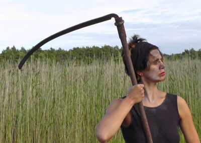 W 2022 roku, równolegle z documenta 15, niemiecko-chiński kurator Qing Cai zorganizował w Kassel międzynarodowy festiwal sztuki live art Overlapping Kassel. Josef Ka, międzynarodowa artystka performatywna, wizualna i dźwiękowa, pojawiła się w drugiej części tego festiwalu. Ponieważ obie nocowałyśmy w miejscu nad Jeziorem Buga, pewnego pięknego słonecznego ranka, gdzieś około godziny szóstej rano, spotkałyśmy się w drzwiach wejściowych naszej rezydencji. Josef Ka stała ubrana w czarny kostium, trzymając butelkę szampana. Zaproponowała mi łyk trunku z butelki. „Na śniadanie?” – zapytałam. „La Boheme” – odpowiedziała. Artystka, chcąc wykorzystać wczesne jasne światło, czekała na sesję zdjęciową przygotowywaną dla niej przez znakomitego węgierskiego fotografa i performera Istvana Kovaca. Na zielonej łące tuż przed budynkiem wykonała performans Śmieszne zabawy w czasie wojny (spektakl dla gęsi).