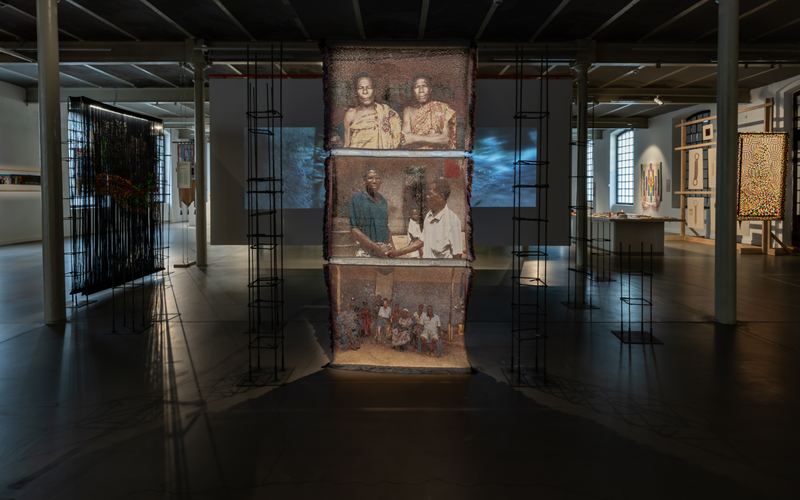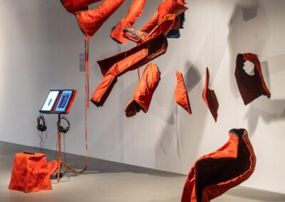 Ostatnia część wystawy, Re-interpretacje języka materii i pamięci, w dużej mierze dotyka historii i przygląda jej się krytycznie. Mamy tu prace odnoszące się zarówno do pamięci indywidualnej (czego przykładem mogą być hafty Manuela Alejandro Hernandeza Rivery na bazie fotografii z rodzinnego archiwum), jak i do szerszych historii o charakterze zbiorowym (jak postkolonialna refleksja Norweżki Eli Herlaug Eines czy odnosząca się do Holocaustu rzeźba Carmen Schabracq). Wątki prywatne bardzo interesująco łączą się z historiami ważnymi dla większych społeczności czy cywilizacji, tworząc interesujący pejzaż form dialogujących ze sobą. W tej części wystawy możemy zobaczyć laureatkę złotego medalu tegorocznej edycji triennale. Uzbecka artystka Aziza Kadyri zaprezentowała transmedialną instalację łączącą nowe technologie z tradycyjnym rzemiosłem. Praca Jej Scena (II) jest osobistym hołdem artystki dla własnej babci, która ulegając patriarchalnym wymaganiom, zrezygnowała w latach pięćdziesiątych z kariery tancerki ludowej w Uzbekistanie. Wielowymiarowość pracy zachowana została nie tylko w sferze formy i użytych technik, lecz, co istotne, również treści – pokazując oryginalnie kontrast między indywiduum a kolektywem. Prywatne ambicje i osobiste marzenia jednostki musiały się bowiem konfrontować nie tylko z patriarchalną rzeczywistością, ale także z opresyjnym systemem politycznym sowieckiego Uzbekistanu. W tej części ekspozycji oprócz nagrodzonej pracy znalazło się jeszcze wiele prac godnych wspomnienia – intrygujących bardziej za pomocą wizualnych gier z odbiorcą niż wyszukanych odniesień. Przykładami takich dzieł są prace Asel Kadyrkhanovej, której hafty są minimalistycznymi w formie obrazami badającymi wizualność zmieniającego się pod wpływem decyzji politycznych alfabetu w Kazachstanie, oraz gobelin Gabriela Pessoto, łączący tradycje tkackie z graficznymi formami interfejsu programu komputerowego.