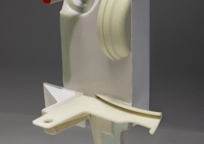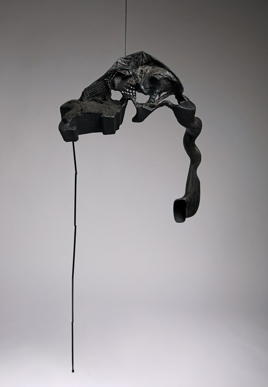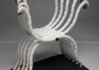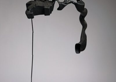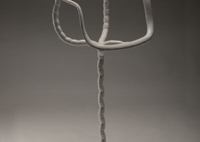 Praktyka twórcza Mateusza Pęka, oparta na uważnej obserwacji złożoności przedmiotów oraz ich ponownym montażu, wpisuje się w specyficzny kontekst elbląskiej galerii. W przeciwieństwie jednak do ciężkich, metalowych form przestrzennych, które na stałe wpisały się w pejzaż miasta, obiekty Pęka manifestują odmienną kategorię trwałości – nieprzemijalność tworzywa sztucznego. Artysta wykorzystuje części samochodowe, poliamidowe kształtki, słomki koktajlowe czy syntetyczną gumę, konstruując organizmy przypominające bezkształtne, bezpłciowe byty, takie jak prezentowane w ramach cyklu obiekty Ameba. Te „rozlewające się” formy, pozbawione wyraźnego szkieletu, wchodzą w niemą polemikę ze strzelistością i tektoniką gotyckiego sklepienia krużganka.