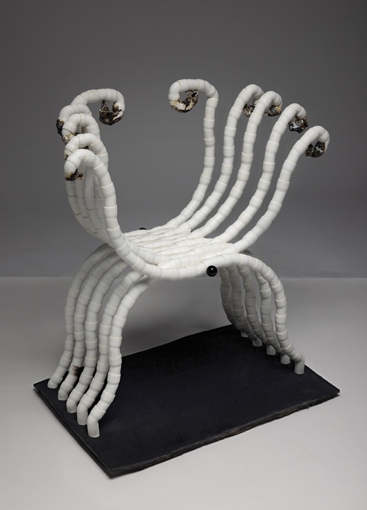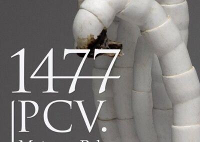 Tytułowe 1477 PCV. – poza dosłownym odniesieniem do liczby wykorzystanych w pracach kształtek z polichlorku winylu – sugeruje zderzenie odległych porządków czasowych i materiałowych. Prezentowane obiekty, mimo swojej pozornej kruchości i grawitacyjnej niestabilności, posiadają walory pomnikowe. Jest to jednak pomnikowość przewrotna, celebrująca „ciało-plastik” – materiał anonimowy, lecz w swojej chemicznej strukturze niemal nieśmiertelny. Satynowy połysk oszlifowanych elementów, zmysłowość konturów przywodząca na myśl modernistyczne wzornictwo oraz silikon mieniący się niczym szlachetne szkliwo zapraszają do dotyku, wciągając widza w grę pozorów. To, co wydaje się ceramiką, okazuje się porowatą syntetyką; to, co wygląda na precyzyjny mechanizm, ujawnia się jako chaotyczny zlepek odpadów cywilizacji.