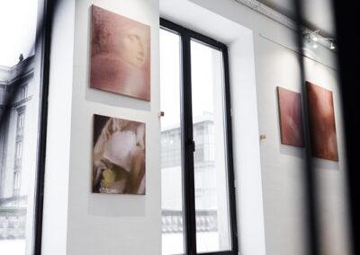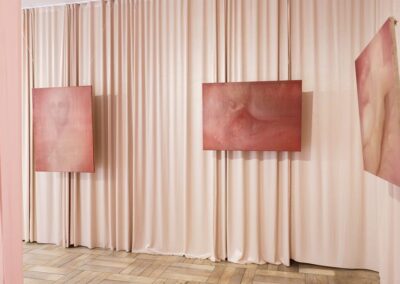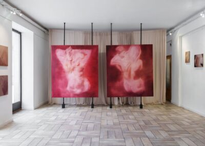Mojemu widzowi życzę przede wszystkim ciekawości, chciałabym, aby moje prace zachęcały do wewnętrznych podróży. Prac jest sporo, dają one możliwość układania własnych scenariuszy, w zależności od potrzeb widza. Na wystawie pojawił się również obiekt przestrzenny – kurtyna-kokon – do którego można wejść, otulić się materiałem i obejrzeć wystawę z perspektywy postaci z obrazu. W kokonie otoczenie będzie lekko rozmyte, jak w chwili zmrużenia oczu. Wystawie będzie również towarzyszył zapach, angażując kolejny zmysł w doświadczenie ekspozycji. Tego życzę mojemu widzowi – aby pozwolił sobie na swobodne doświadczanie i zanurzenie się w ekspozycji.