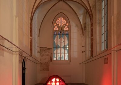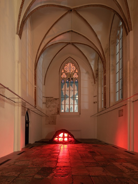 Istotnym kontekstem wystawy jest przestrzeń Galerii EL – zdesakralizowany kościół, miejsce naznaczone historią rytuału, wspólnoty i transcendencji. Na ile ta architektura stała się dla Ciebie równorzędnym „materiałem” pracy? Czy postrzegasz ją jako kontynuację paleolitycznych przestrzeni rytualnych, czy raczej jako pole napięcia między sacrum a jego rozpadem?