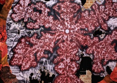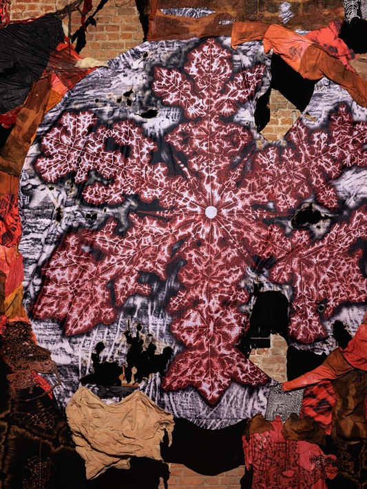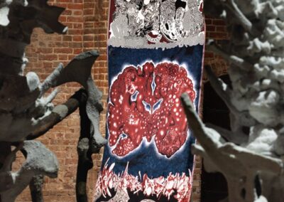 Równolegle toczą się także liczne eksperymenty związane z tkaniem, wybarwianiem, barwieniem i łączeniem różnych tkanin. Dzięki Tosi i Izie (The Most) aktywnie produkujemy i eksperymentujemy również na poziomie tkackim, tworząc złożone formy żakardowe. W ten sposób wszystkie te wątki splatają się we wspólny konglomerat – plastyczne ciało naszej wystawy.