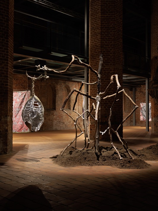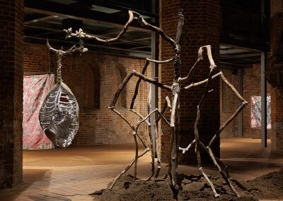 Dominującą część architektury naszej wystawy zbudowałem z suchych gałęzi i konarów pochodzących z bukowego lasu za moim domem. Zależało mi na tym, aby główny budulec był plastyczny i przyjemny w obróbce, a jednocześnie bliski realiom materialnym omawianego okresu. Zasuszone, okorowane gałęzie mają w sobie – na poziomie wizualnym – bardzo dużo z kości.